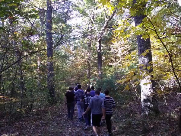 Mr. Ambrose's junior honors English class enters the Fells Reservation, adjacent to Medford High School, Fall 2014.