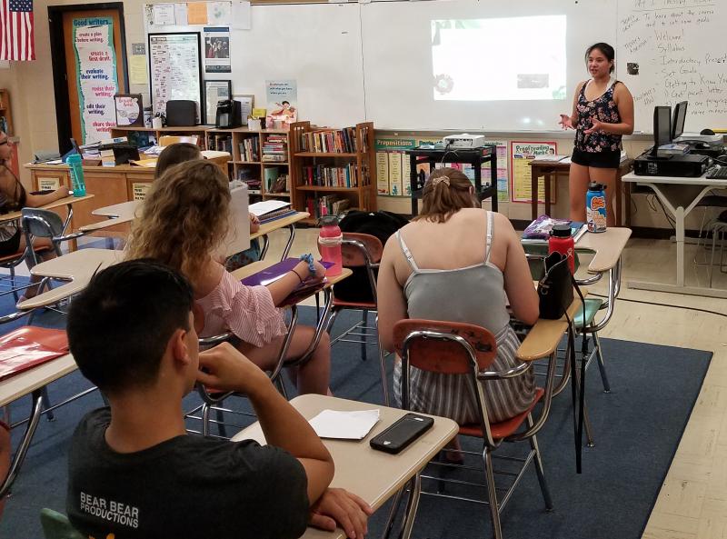 Senior co-editor-in-chief Kylie Truong presents in yearbook class on the first day of school, 8.28.2018.